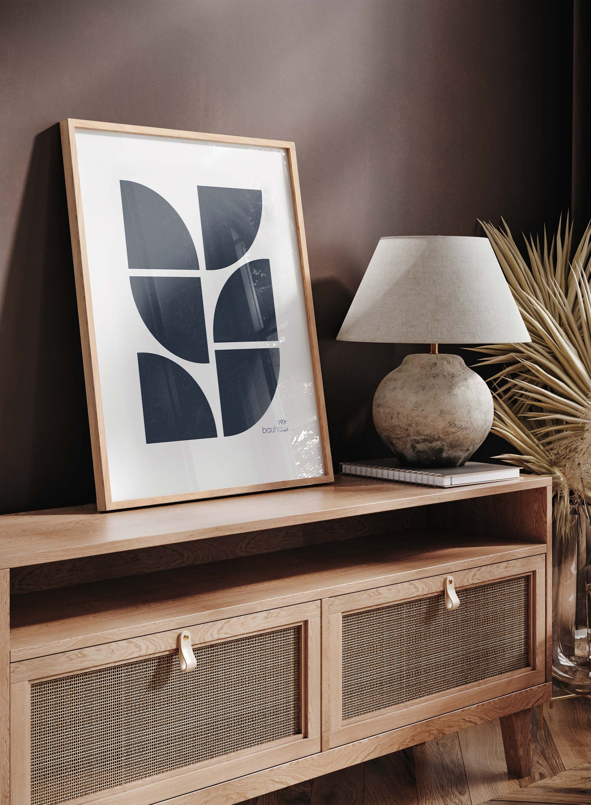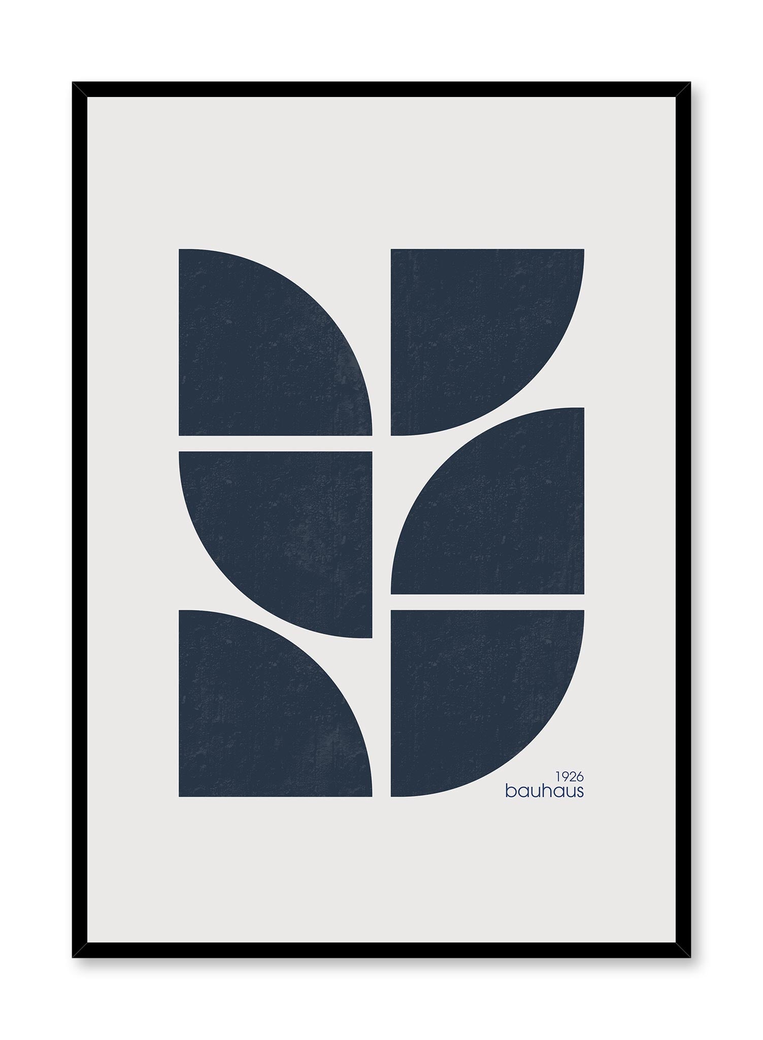 The Anni poster is quintessential Bauhaus art! With its cool geometric design and mid-century modern typography, this art print will look great in all homes. The poster features a composition of triangular shapes with rounded edges in navy blue over a beige background. The date 1926 and the word bauhaus are also featured on this art print in reference to the launch of the Bauhaus journals in 1926.