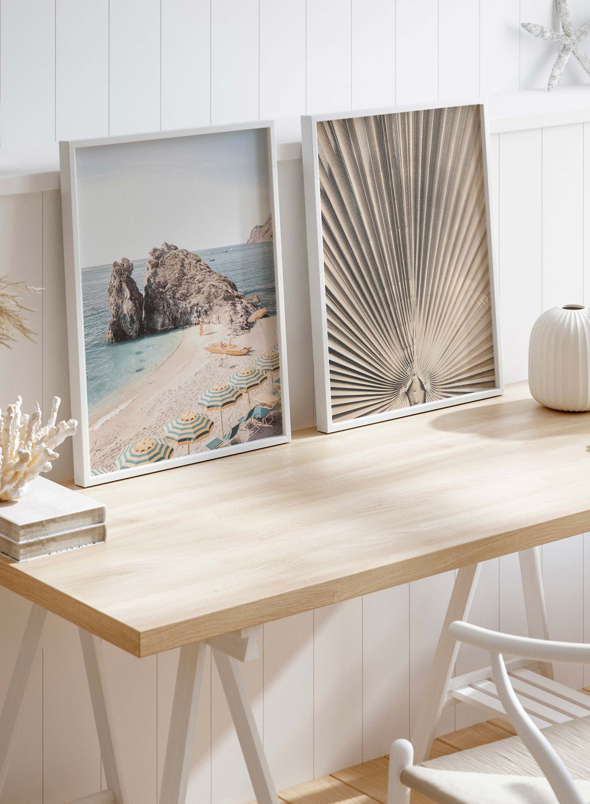 This beach photography poster of the town of Monterosso in Cinque Terre, Italy is the perfect way to add summer vibes to your home. Decorate your walls with this art print of the sea with parasols and large boulders.