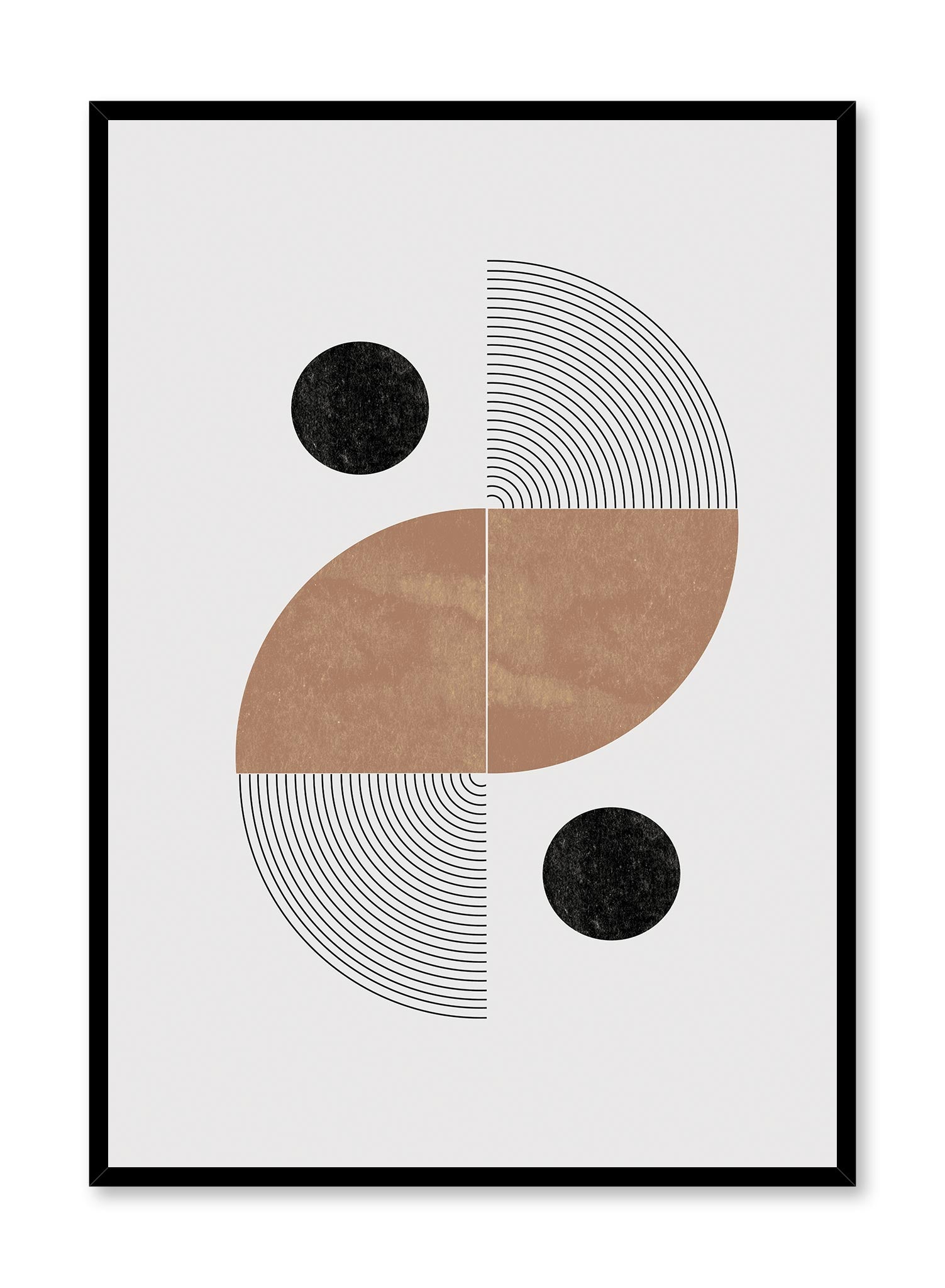 Meet László, a stunning mid-century modern style poster featuring textured black circles, and brown and striped quarter circles in a dynamic composition. This Bauhaus-style geometric art print will add style and sophistication to any home.