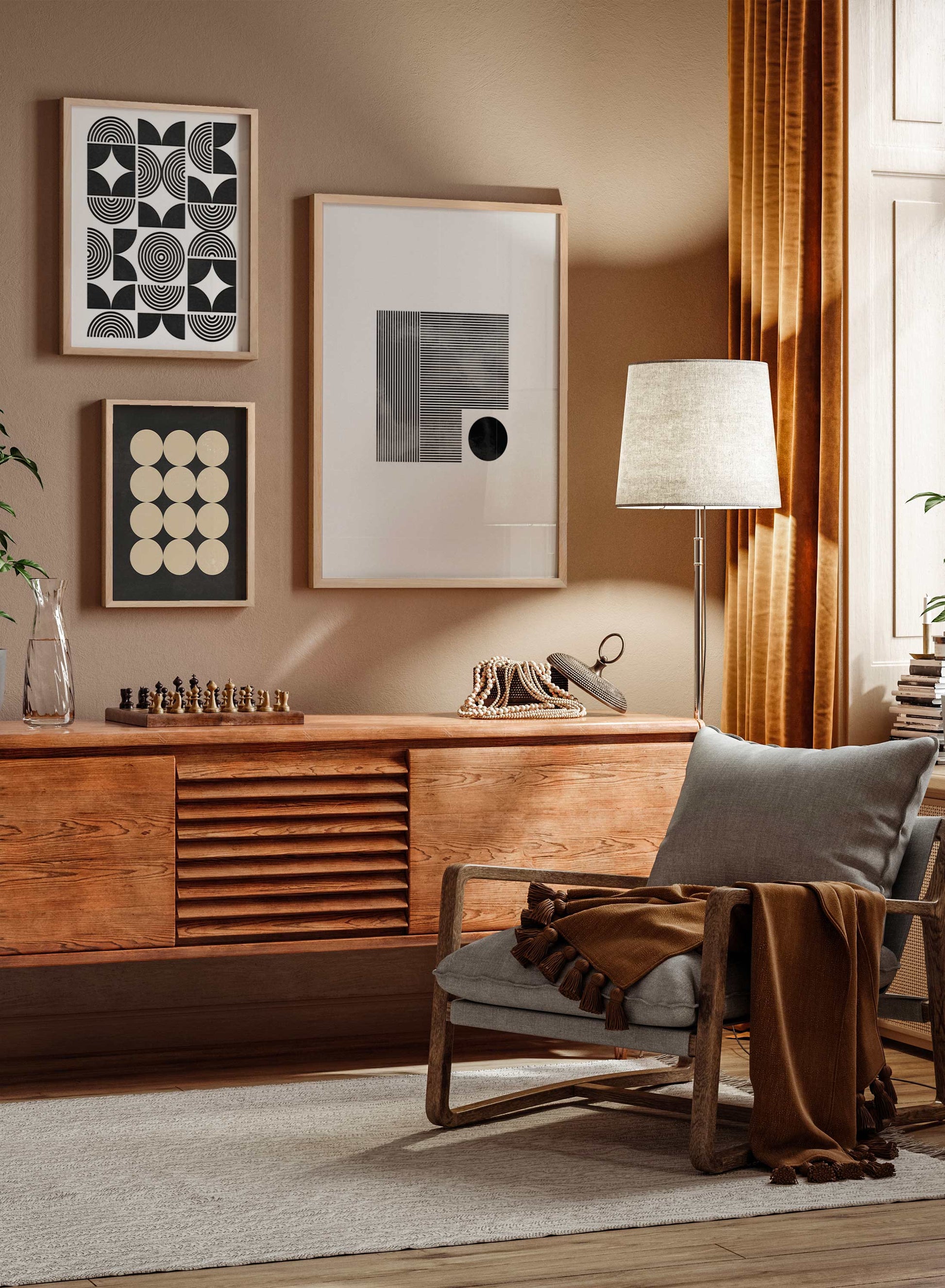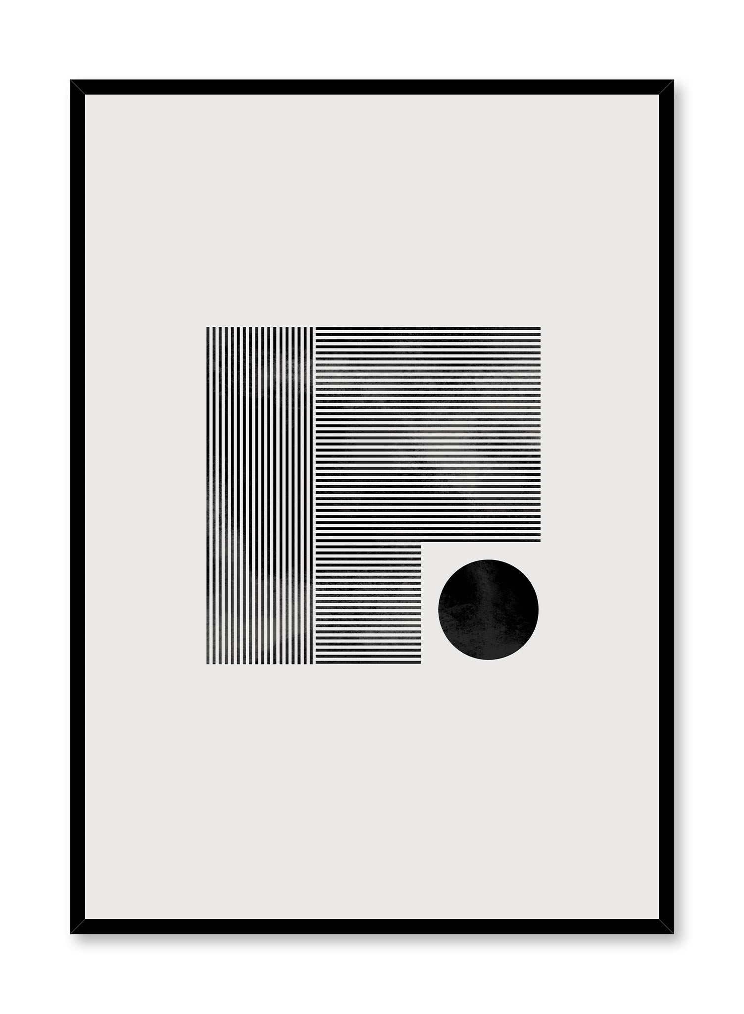 Bauhaus design enthusiasts will love the Marcel poster with its subtle beige background and captivating stripes. This mid-century modern style poster features a black geometrical shape created with vertical and horizontal black stripes in contrast with a bold black circle. With its dynamic composition and simple bauhaus vintage design, this art print will add style and sophistication to any home.