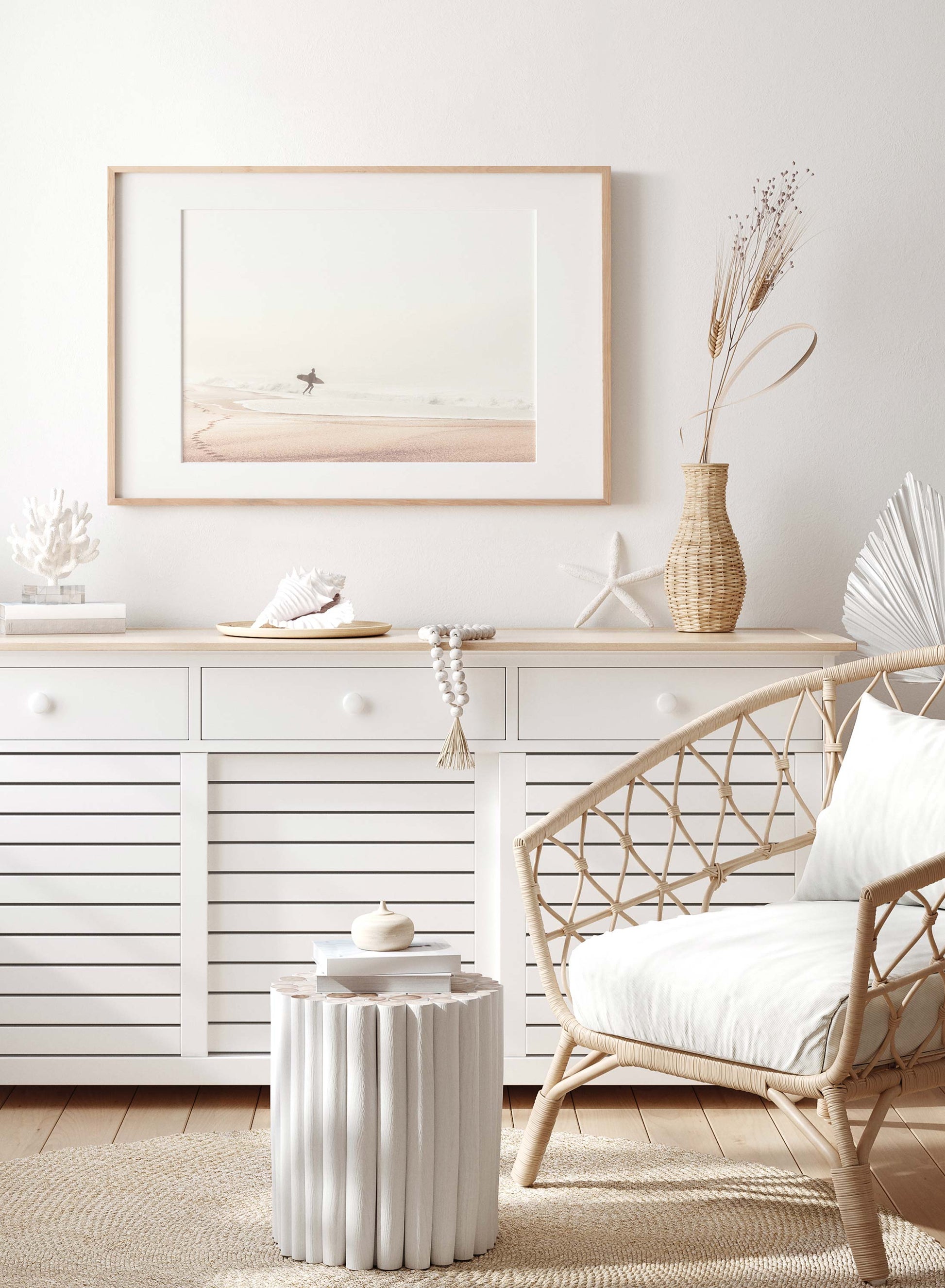 If you dream of the surf life, then this misty beach photography poster of a surfer going toward the waves is for you! Enjoy the beauty of the ocean all day with this surf-themed art print.