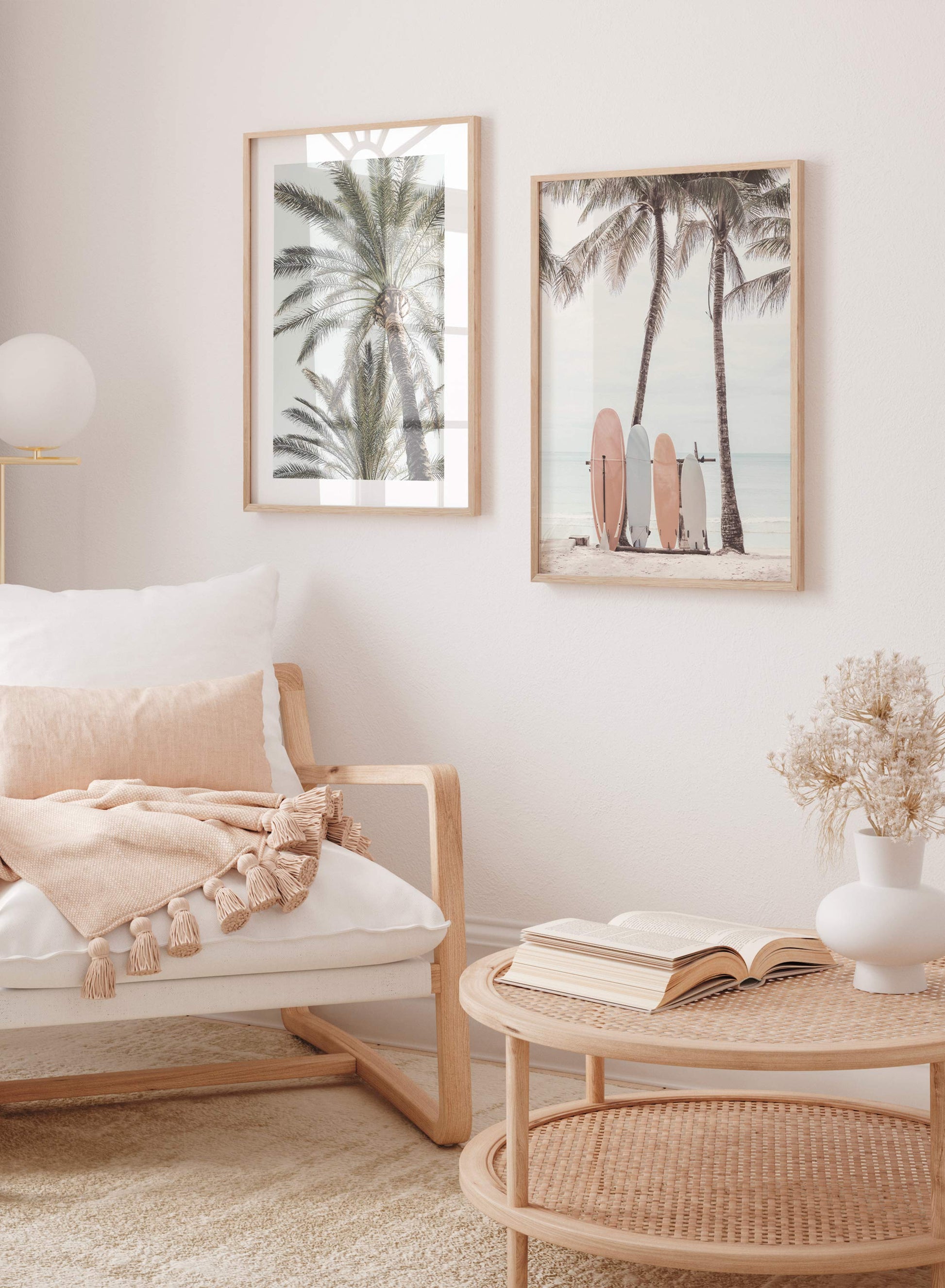 This beach photography poster evokes perfect summer days surfing the ocean waves. Upgrade your decor with this image of surfboards lined up against palm trees in front of the sea.